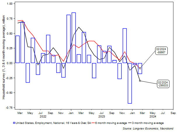 Weekly jobless claims and the establishment non-farm payrolls (NFP) data are two key labour market datasets which point to a robust US labour market. Last month according to the NFP data, the US economy added 275k net new jobs (after 229k in Jan). Weekly jobless claims, meanwhile, remain just above 200k with no sign of deterioration.