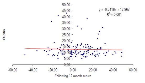 That was the conclusion of our analysis of the efficacy of the PER and ERP in forecasting 1 and 3 year returns in the stock market. In that 2006 analysis (“Does Valuation Matter?”), we looked at over 100 years of data using a forward PER for the S&P500 on the 1st January each year (based on the following 12 months’ actual earnings1) and plotted that ratio against the S&P’s returns over the course of that year (following 12 months). The resulting graph can be seen below in fig 9, and shows that there is zero correlation between the two variables. Similar exercises were carried out for a 3 year return period and for the ERP (with the same result). Valuation ratios are clearly, therefore, not good market timing tools.