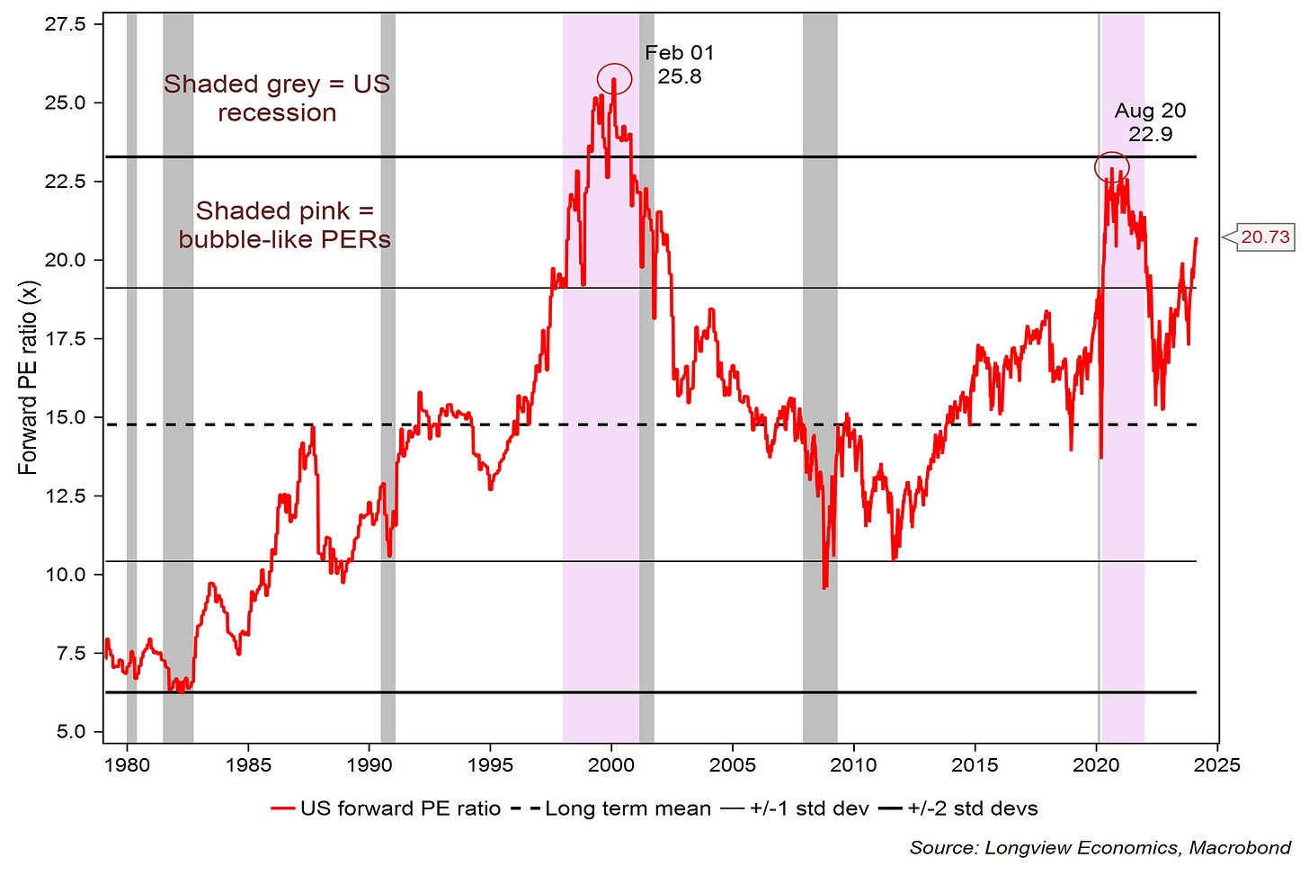 Other approaches to valuing the US market have the same message. The S&P500’s PE ratio (based on forward 12m rolling consensus earnings) is at one of its highest levels in the past 45 years (i.e. all the history we have using forward consensus EPS, see fig 9i). On the latest data the PER is 20.7x. As the chart shows, only in the pandemic liquidity fuelled market (2020/21) and the TMT bubble, did the S&P500 have a higher PE ratio. At all other times over the past 45 years, it’s been lower. The Shiller CAPE ratio has a similar message, reaching 33x in recent weeks (above its 1929 peak just ahead of the October 1929 crash and only surpassed in the pandemic and the TMT bubble, fig 9xvii).