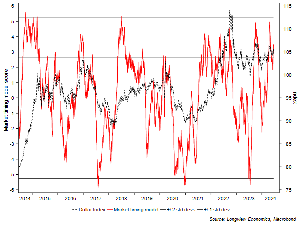 The ‘dollar market timing’ model (fig 3), which aggregates those factors along with our technical scoring system, is therefore on SELL (at its +1 standard deviation level). On many occasions, those SELL signals have been efficacious & timely. In a handful of instances, though, they have been early (or wrong).
