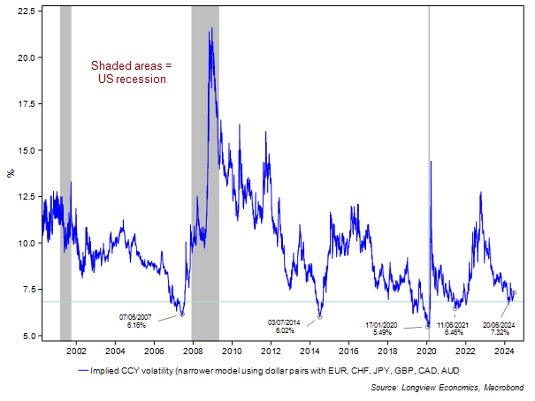 Like in equities, therefore, currency volatility has died a death in 2024. As fig 1 shows, the average volatility of various major currency pairs (all against the dollar) has fallen to one of its lowest levels on record (although still not as low as January 2020, June 2021, July 2014 and June 2007). On all of those occasions currency volatility made a major record low and then, within a handful of months, a major volatility event happened in financial markets. June 2007, of course, was followed by the global financial crisis; July 2014 saw significant equity volatility in the second half of the year (and then the Chinese currency crisis in 2015 – although that was a year later); January 2020 was just ahead of the pandemic (so arguably exogenous, albeit various models at that time were highlighting the risk of a volatility event); while June 2021’s currency volatility low was followed at the end of the year by the start of a cyclical equity bear market. Low volatility encourages more leverage and therefore creates its own environment for a volatility event.